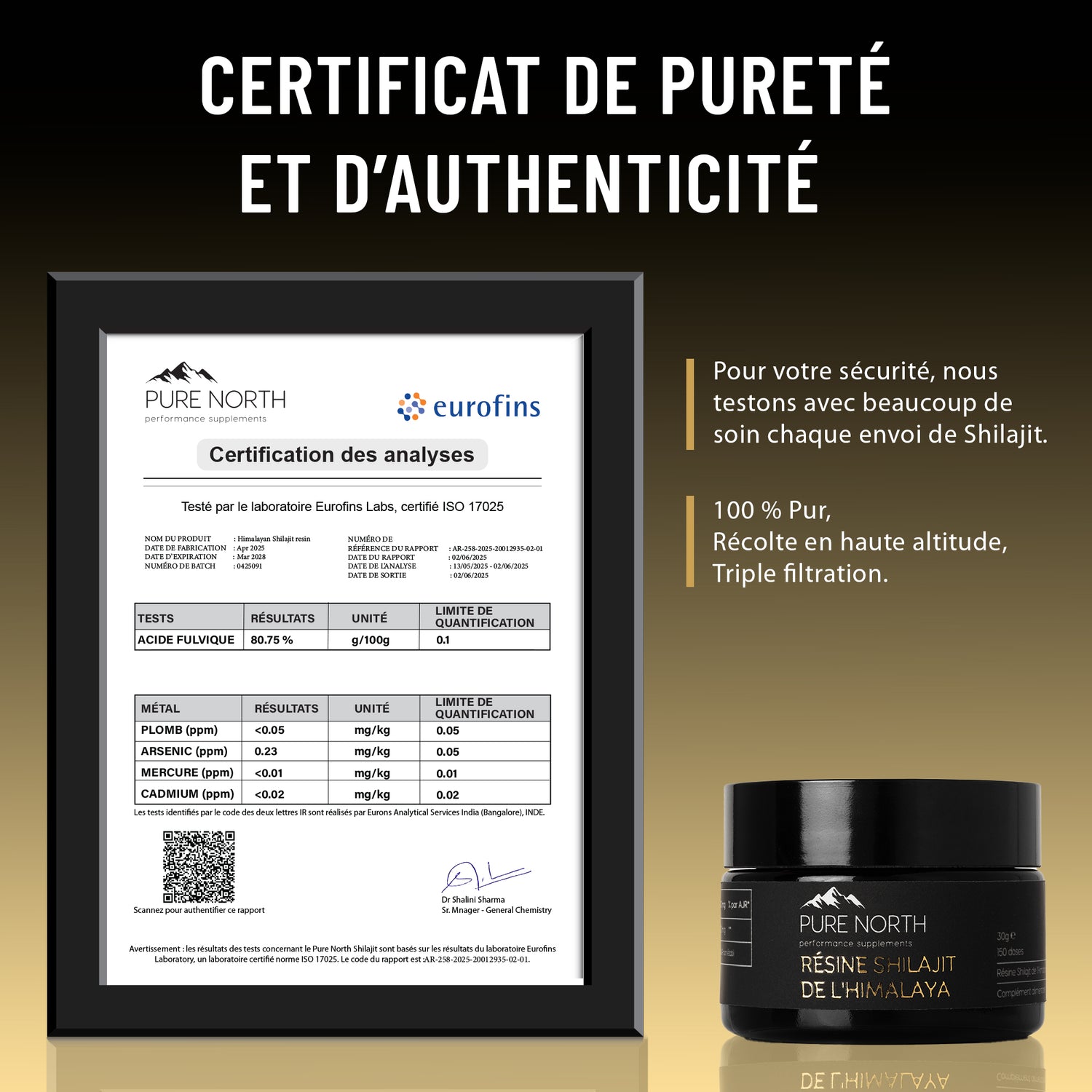 Le shilajit de Pure North est soigneusement sélectionné pour être le plus pur du marché, sans additifs et avec une teneur élevée en acide fulvique. Notre shilajit est testé en laboratoire pour garantir son authenticité, sa pureté et l'absence de métaux lourds et il est certifié HACCP. Chaque pot est scellé avec soin lors de la production pour garantir la pureté et la sécurité du produit.